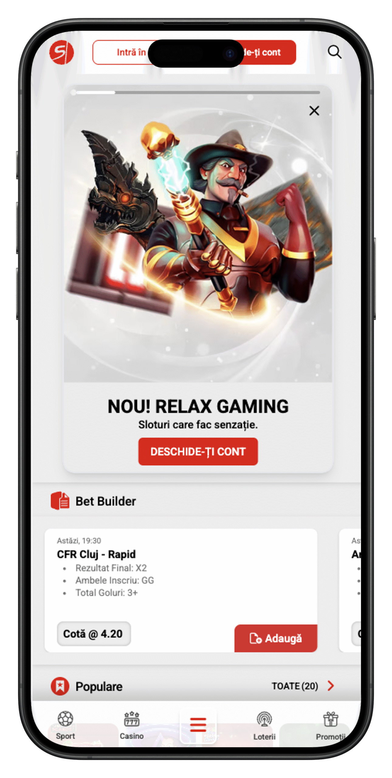- Din meniul principal, găsiți secțiunea „Sport” sau „Live”, în funcție de tipul de pariu dorit.