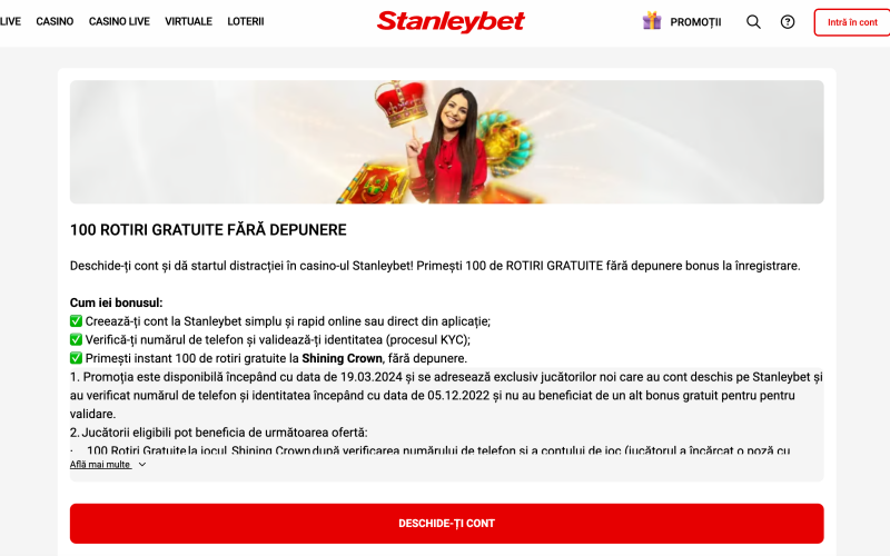 Cea mai populară promoție de la Stanleybet este Stanleybet bonus fara depunere, care vă oferă ocazia de a câștiga bani reali fără a cheltui bani proprii. Stanleybet bonus fara depunere apare rar, de obicei sub forma unei sume mici de bani bonus sau a unui număr de rotiri gratuite. Este o modalitate excelentă de a testa anumite tipuri de jocuri și de a te familiariza cu platforma înainte de a începe să investești bani.