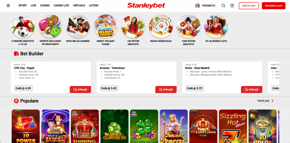 Stanleybet casino oferă mult mai mult decât doar pariuri sportive. Acest nume cunoscut la nivel global a reușit să îmbine cu succes tradiția caselor de pariuri fizice cu dezvoltarea unei platforme online inovatoare în Romania. Stanleybet este un site de încredere datorită cotei sale atractive de evenimente sportive și a colecției sale bogate de jocuri de cazino. Scopul său este de a oferi jucătorilor o experiență de joc sigură, echitabilă și foarte distractivă. Stanleybet casino oferă o experiență premium pe lângă secțiunea de sport.